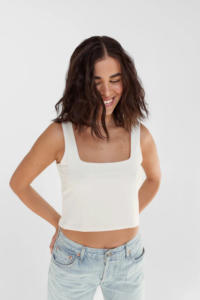 La coupe : Cette camisole à encolure carrée est confectionnée dans un tissu ultra-doux, entièrement doublé, qui offre un confort incomparable. Sa coupe arrive au niveau du nombril et ses larges bretelles apportent une touche moderne. Idéal pour un look à la fois simple et élégant, ce haut se porte seul ou sous une veste.