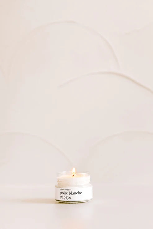 Découvrez la chandelle de soya Poire blanche papaye, une fusion enivrante entre la douceur de la poire blanche et l'exotisme juteux de la papaye.