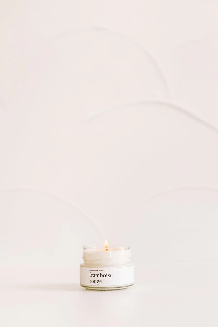 La chandelle de soya Framboise rouge, un amalgame fruité et rafraîchissant qui évoque la douceur juteuse et acidulée de cette baie.