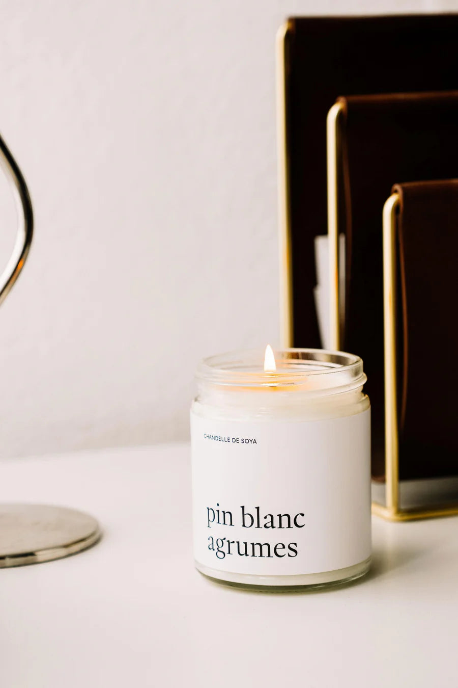 Découvrez la chandelle de soya Pin blanc agrumes, un mariage rafraîchissant entre la fraîcheur naturelle du pin blanc et la vivacité des agrumes.
