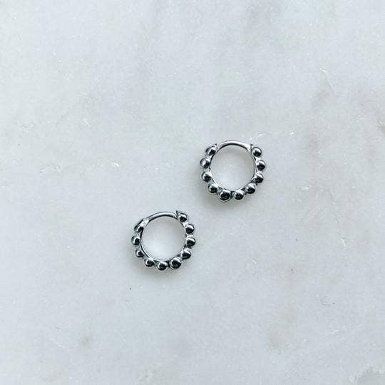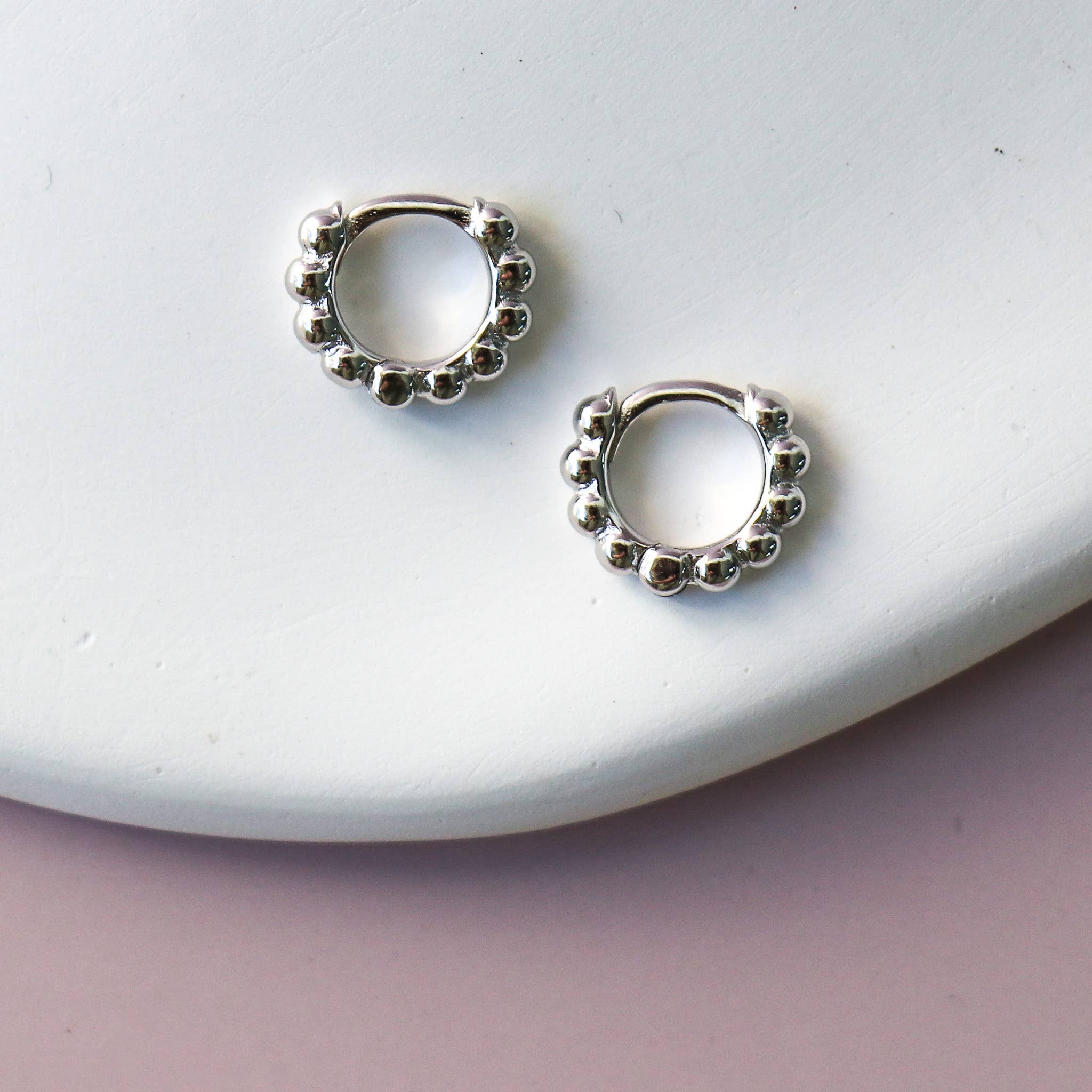 Petites boucles d'oreilles dormeuses décorées de petites perles. Elles sont délicates et idéales pour les deuxièmes trous de perçage. Matériaux Argent sterling .925 Imperméable Dimensions Diamètre interne : entre 6 et 7 mm Diamètre total : 10 mm