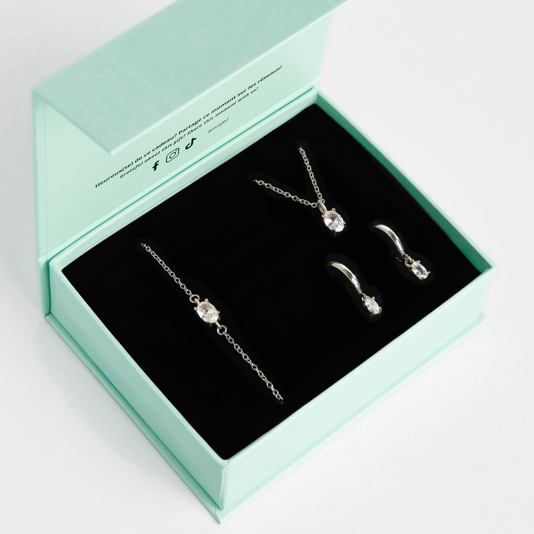 Élevez votre art de donner des cadeaux avec cet ensemble de bijoux éclatants, conçus pour inspirer la joie et la gratitude. Offrir ces pièces élégantes est une manière significative de montrer votre admiration et votre affection pour une femme spéciale dans votre vie