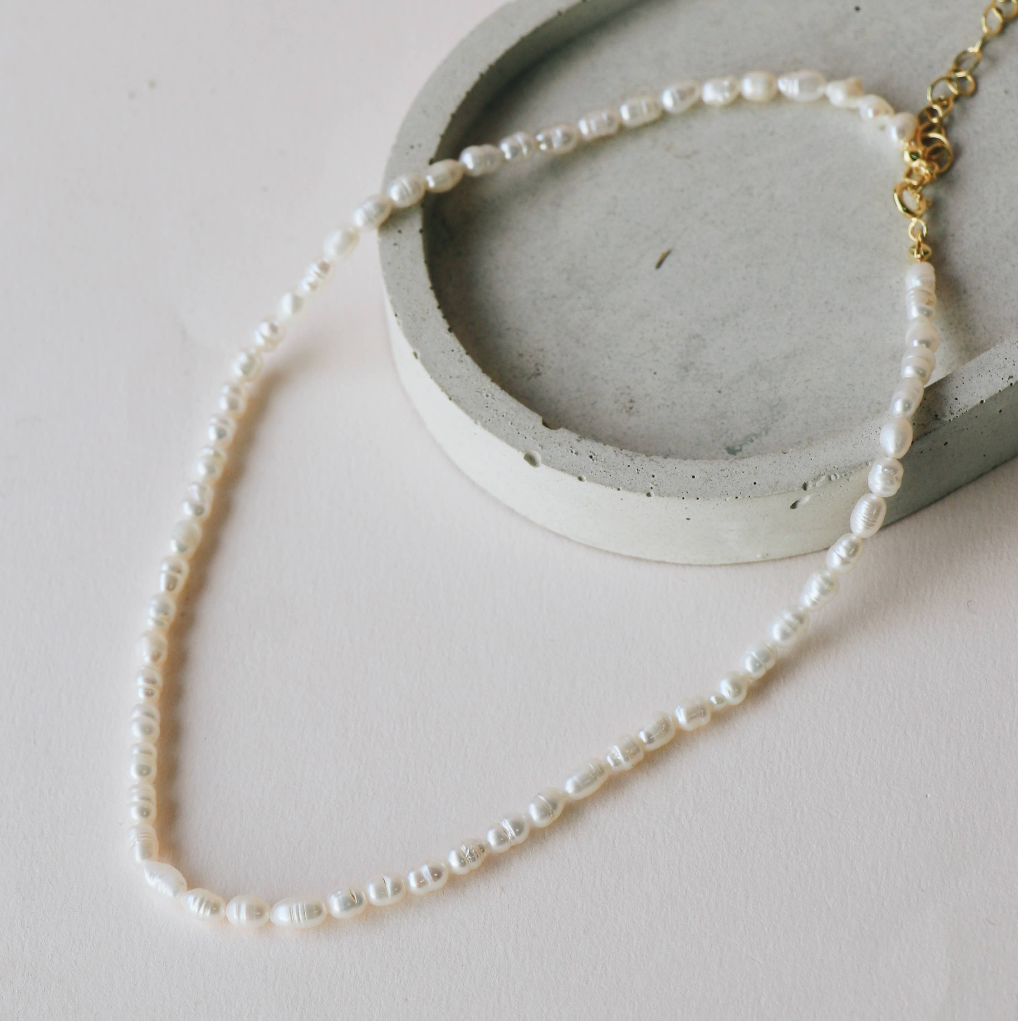 Collier en perles d'eau douce près du cou. Un classique à avoir dans sa boîte à bijoux. Les perles d'eau douce ont la particularité d'être toutes différentes ce qui leur confère leur charme. Chaque collier est donc unique ! Matériaux Perles d'eau douce Argent sterling .925 plaqué or 18 carats Dimensions Taille de la perle : 6-7 mm Longueur minimale : 41 cm Longueur maximale : 47 cm Réglable