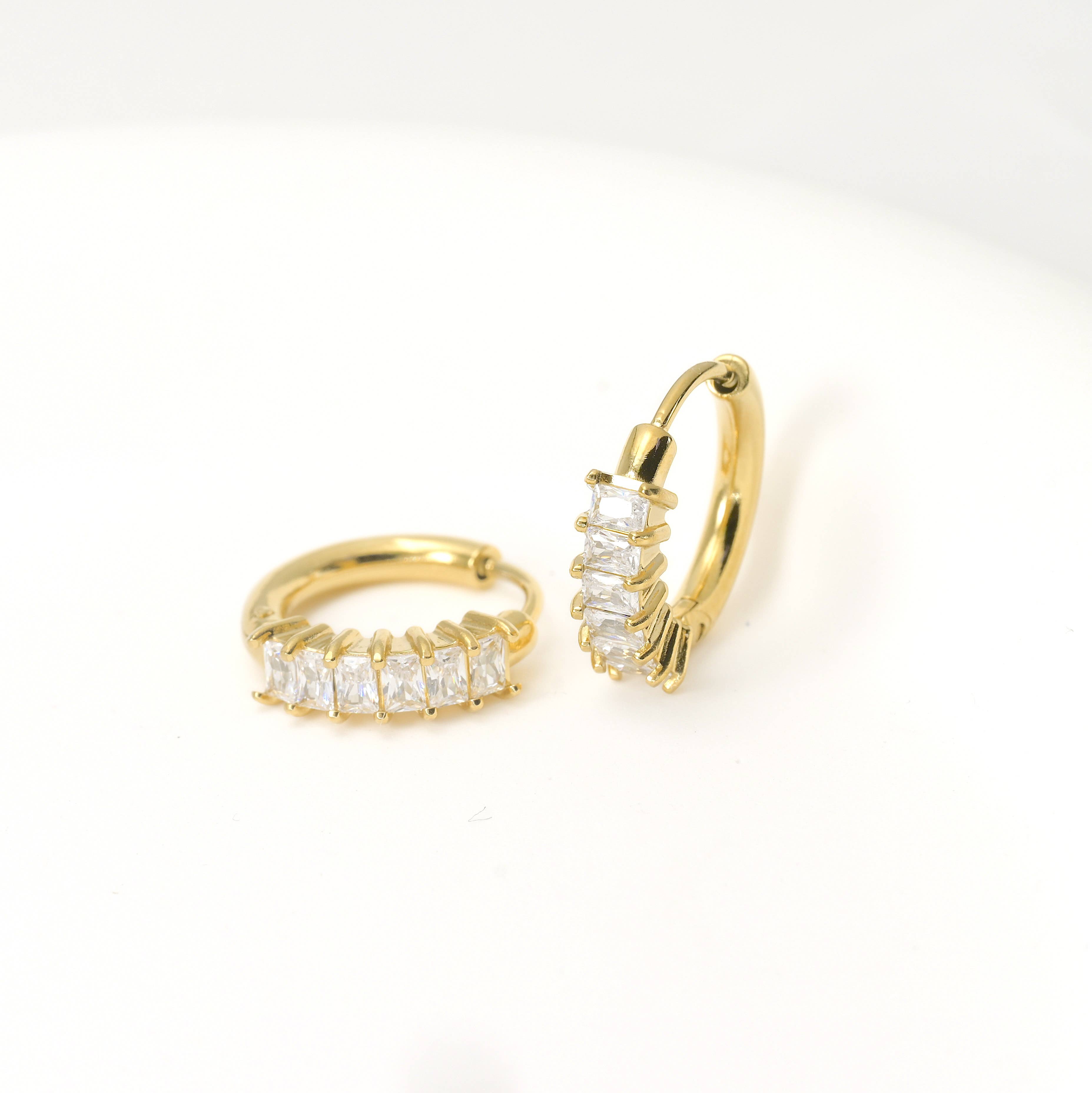 Les petites créoles baguettes en acier inoxydable avec zircones cubiques, aux finitions dorées et argentées, offrent un éclat intemporel. Résistant au ternissement et durable, parfait pour ajouter du glamour à n'importe quelle tenue.