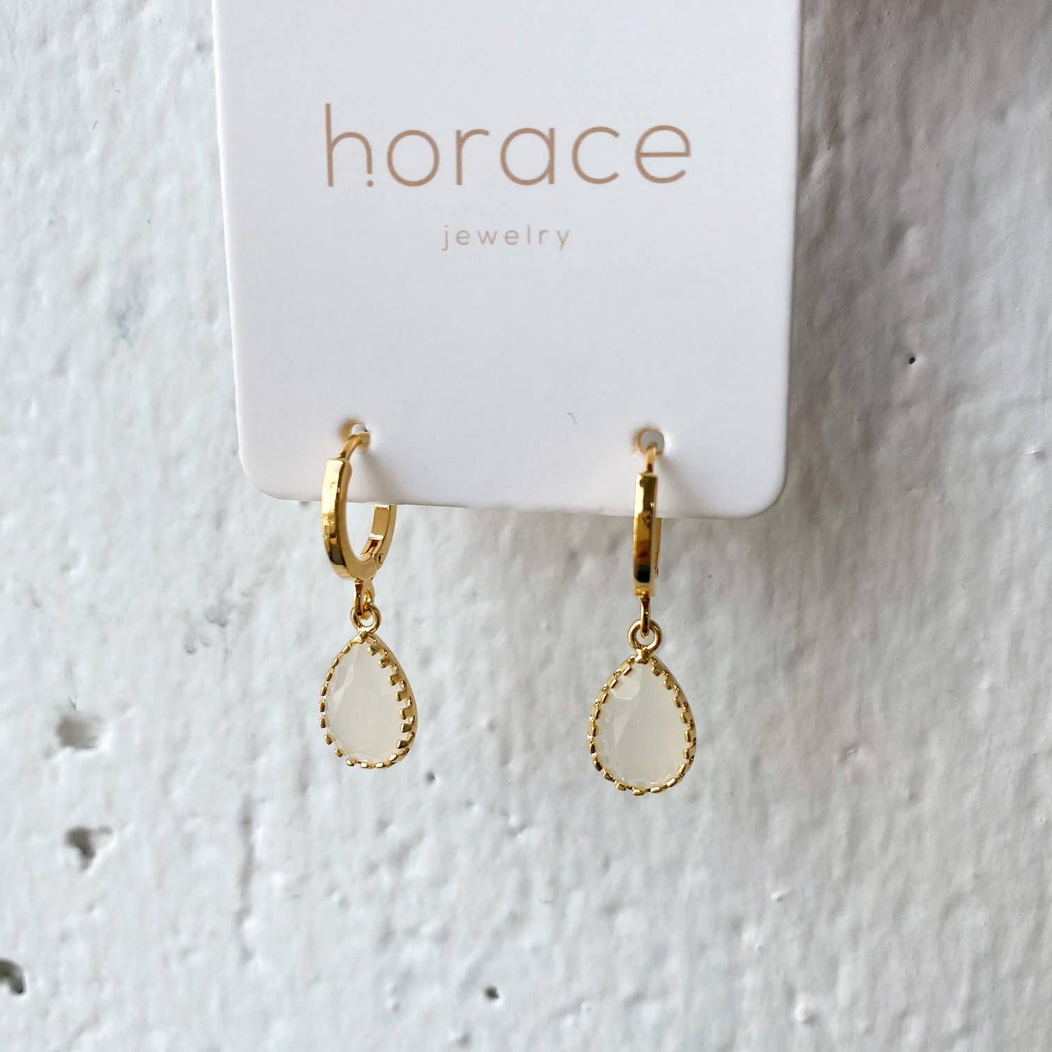 Boucles d'oreilles dormeuses ornées d'un pendentif en forme de goutte en pierre de verre de couleur crème. Matériaux Laiton plaqué or 16k Pierre de verre Dimensions Longueur totale : 25mm Diamètre interne du cercle : 9mm