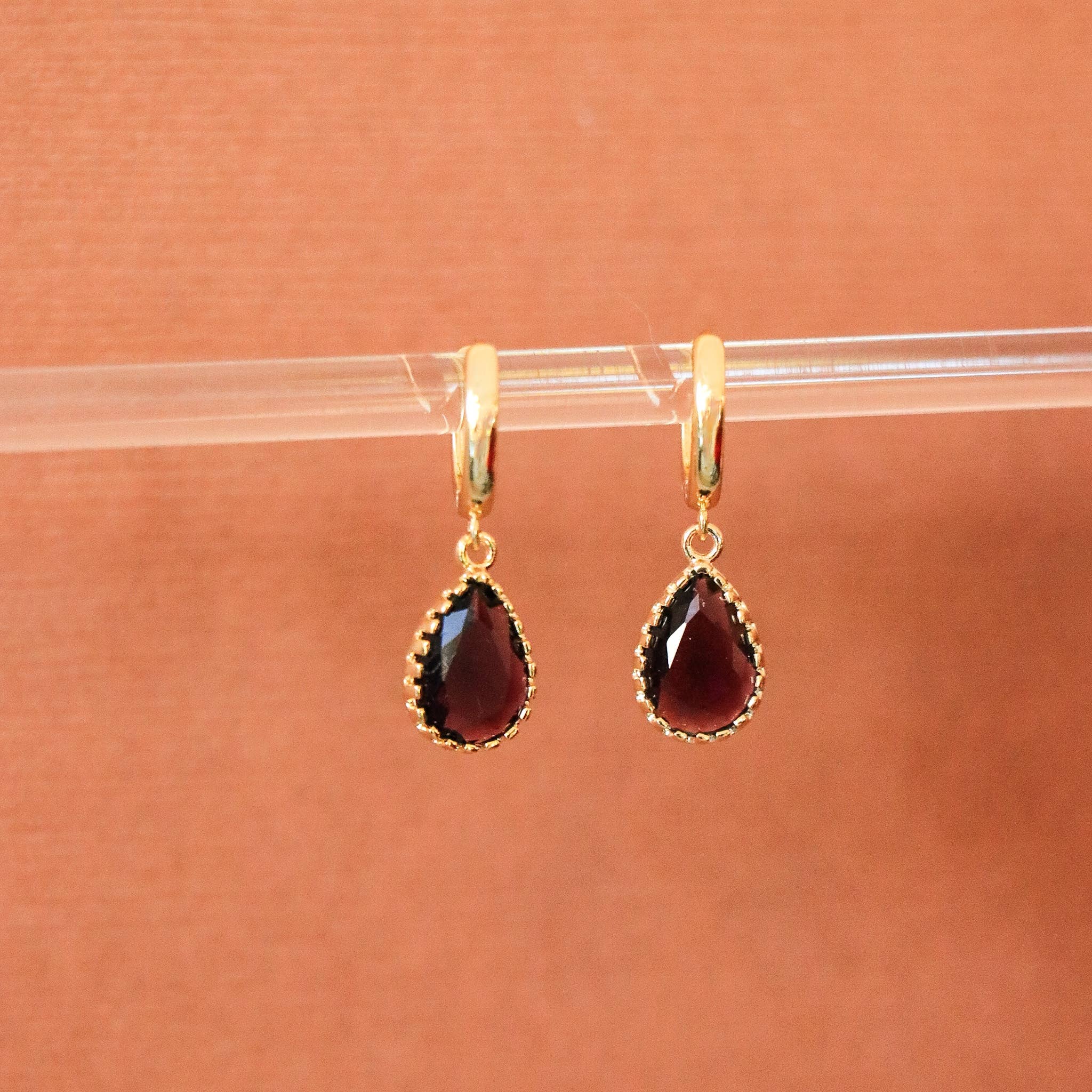 Boucles d'oreilles de type dormeuses ornées d'un pendentif en forme de goutte en pierre de verre bordeaux. Matériaux Laiton plaqué or 16k Pierre de verre Dimensions Longueur totale : 25 mm Diamètre interne du cercle : 9 mm