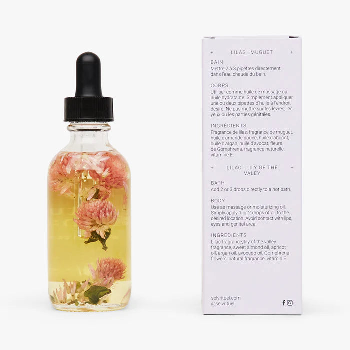 Huile de Prunus Amygdalus Dulcis (Amande), Huile d'Olus (et) Huile de Persea Gratissima (Avocat), Huile d'Olus (et) Huile de Noyau de Prunus Armeniaca (Abricot), Huile d'Olus (et) Huile de Noyau d'Argania Spinosa (Argan), Fragrance Naturelle de Lilas, Fragrance Naturelle de Muguet, Gomphrenas et Tocophérol.