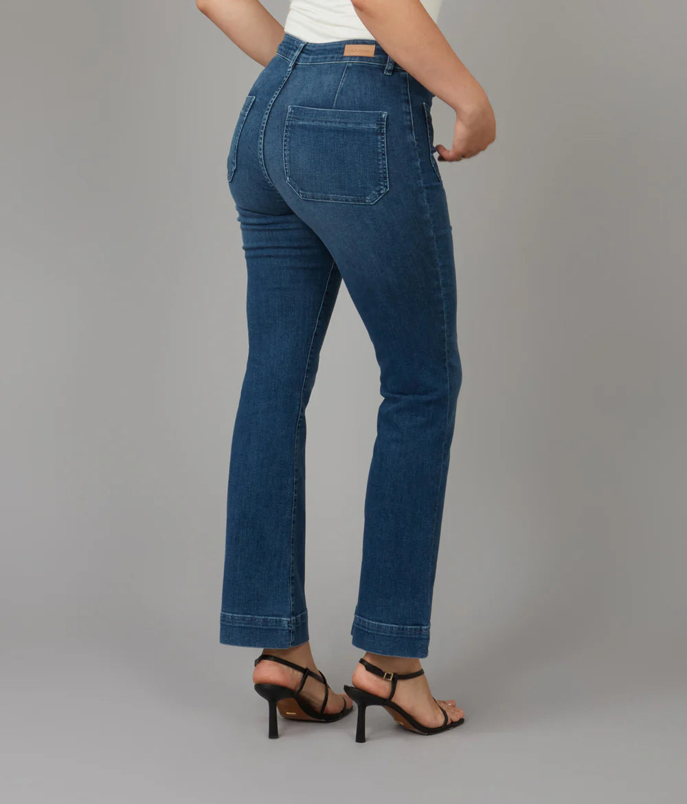 Le Gene est un jean bootcut taille mi-haute parfaitement construit. Serrant les cuisses aux bons endroits et s’amenuisant plus largement vers la cheville. Le Gene in Dim Sky est un délavage bleu classique avec des poches plaquées avant et arrière.