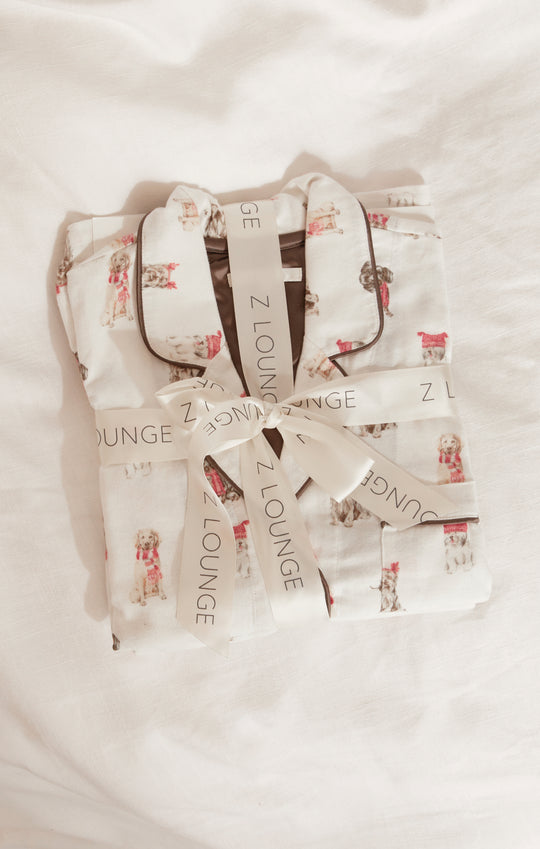 Cet ensemble pyjama est si confortable que vous aurez envie de dormir toute la journée dedans ! L'ensemble de pyjama Sleep All Day est composé à 100 % de coton et comprend un imprimé de chiots adorable un bouton, un haut à col et un pantalon droit.