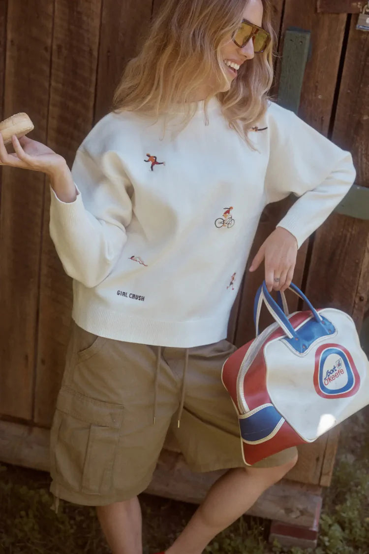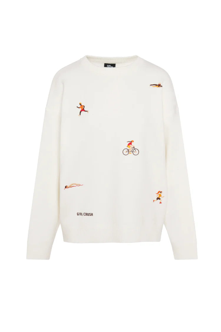 Le Pull l'Athlétique rend hommage aux sportifs et sportives de cœur, à celles et ceux qui collectionnent les souvenirs comme on collectionne les “j’aime” sur Strava. Son illustration délicate met en scène les trois disciplines d’un triathlon — natation, cyclisme, course — comme des petites vignettes d’été actives. Tricoté dans une maille douce et légère, il est aussi confortable qu’une journée passée au grand air. Sa coupe légèrement oversized en fait la pièce parfaite pour se réchauffer après un entraînement ou simplement pour prolonger cette sensation de fierté qu’on ressent à la ligne d’arrivée.